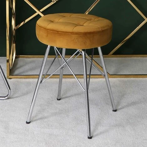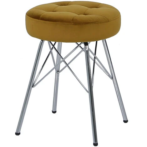 A modern stool, featuring chic chrome finished legs with crossed-design and a lovely button-tufted mustard velvet fabric upholstered padded seat. A functional and space saving tufted stool, ideal for a room with limited space and best for bedroom, living room and dressing room.