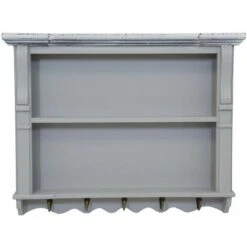 This wall shelf unit is finished in grey with a natural wooden top. It has 2 shelves and handy coat hooks providing plenty of storage space which would be ideal in any kitchen, dining room or hallway. This wall shelf is perfect for displaying your items without taking up any floor space. With a shabby chic/distressed finish and features detailing on the sides, it comes ready assembled so you can enjoy it straight away.