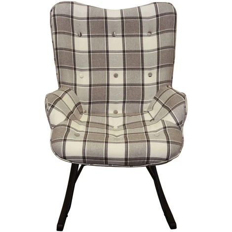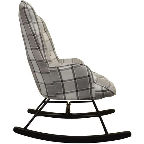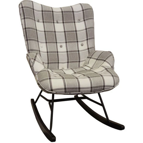Contemporary twist on a traditional rocking chair. Manufactured using a sturdy steel frame with sturdy wooden rockers finished in black and upholstered with a high quality buttoned large check fabric – very comfortable. Ideal for living areas, bedrooms and nurseries. Frame requires minimal assembly. Seat height 47cm. Fully complies with UK FR regulations. SIZE: 101h x 70w x 85d cm MATERIALS: FR Fabric / FR Foam / Metal / Solid Wood COLOUR/FINISH: Grey / White / Black Easy Self Assembly – build time: 20 mins approx