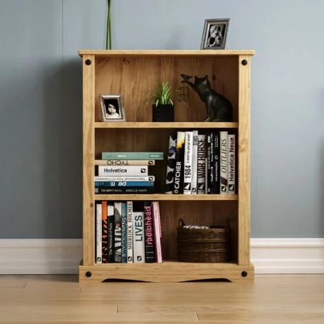 Home Discount offers this stunning and handy living room gem, the Corona Low Bookcase. Instead of piling up your favourite novels in messy, metre high stacks on your floor, give them a permanent home in this solid pine bookcase! The generous and attractive design provides a plethora of space to organize your novels! Moreover, there is enough space on top for cute decorative items such as framed photos or plants. Bookcase features a curved plinth at the bottom and is complemented with black metal elements.