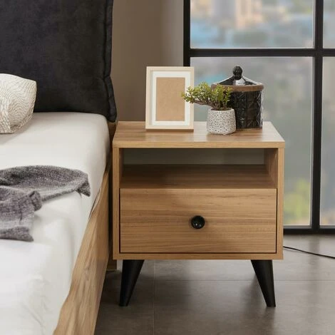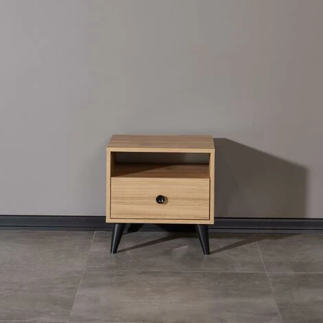 The bedside table is made of prime quality chipboard. The legs are made of plastic material. Body colour: Oak. Leg colour: Black