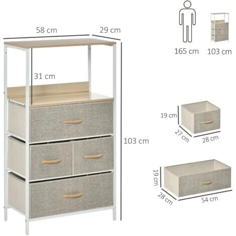 ● Dimensions: 103H x 58W x 29Dcm. Shelf: 31H x 54.5W x 27Dcm. Drawer inner: small: 18.5H x 27.2W x 26.2Dcm. Large: 18.5H x 53.2W x 27.2Dcm.● Weight capacity: Whole: 32kg. Top shelf: 10kg. Middle Shelf: 8kg. Large drawer: 5kg. Small drawer: 2kg