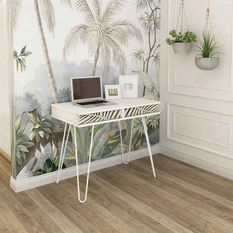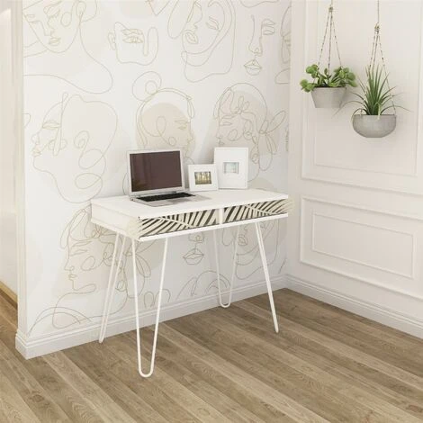 The table-top is made of high-quality melamine faced chipboard finished in white colour and the sliding doors are made of laser-cut 3mm MDF board. It features slender white electrostatic painted metal legs.