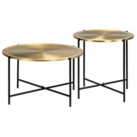 This 2-piece Industrial Coffee Table set oozes industrial style and will make a timeless addition to your home. These tables can be used as coffee tables in the living room or as nightstands in the bedroom. This Industrial Coffee Table set have a sturdy and secure MDF tabletop that has been covered in a sheet of brass, which gives them an antique look. This Industrial Coffee Table will provide an ideal place to keep your drinks, fruit baskets, vases or any other items that you’d like to keep within reach. The steel legs add to the side tables’ stability and durability as well as their industrial charm. Assembly is easy.  Delivery includes 2 tables in different sizes.   FEATURES  Large Table Dimensions: 62 x 35 cm (Diameter x H) Small Table Dimensions: 47 x 45 cm (Diameter x H) Industrial Coffee Table supplied Flat Pack Material: Brass-Covered MDF, Steel/Metal Legs Finish: Brass/Gold, Black Legs