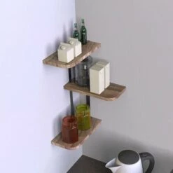 A compact 3-tier corner wall shelf for better utilizing wall space especially corner space to organize knickknacks, display mementos or decorative items, store toys or books in any room like bedroom, living room, bathroom, kitchen and pantry. Mount the three wood pieces in different ways to create different shelf shape as well as staggered shelving space
