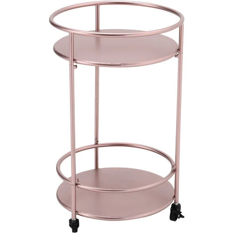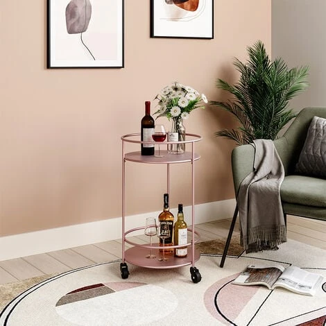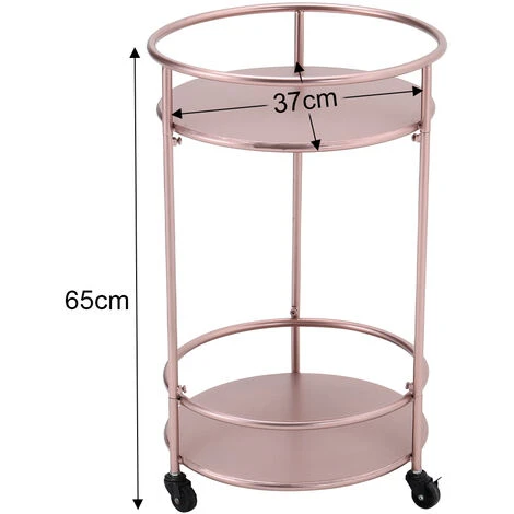 This modern serving trolley has two golden metal shelves with shelf guards. It