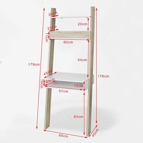 | Large desk area so you can have more than enough room for your computer or reading material. | Trendy ladder style for this shelving unit with 4 floors. 1 shelf on top and 1 drawer for storing and display. | For safety reasons, this shelf is attached to the wall using nails. | Delicate design adds beauty to your house. It is in line with various home style. |