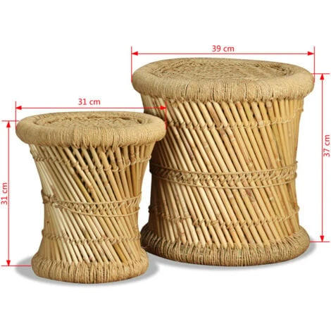 Their high-quality bamboo structure makes the stools stable and weatherproof and therefore suitable for both indoor and outdoor use. The seat is crafted from natural jute in a beautiful woven pattern. The authentic bamboo and jute colour will add a touch of natural charm to your decor. The stools can be stacked neatly when not in use to save space.