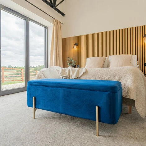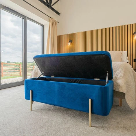 This blue fabric storage ottoman bench is a gorgeous and multifunctional piece of furniture that will add a touch of luxury to any room. The deep blue colour is rich and sophisticated, and the gold metal legs add a touch of elegance. The ottoman is perfect for storing blankets, pillows, or other items, and can also be used as a bench or footrest. It’s a versatile piece that will make a great addition to any home.