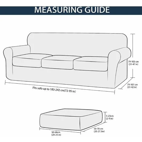 - Please measure your sofa before choosing our sofa covers for replacement 3 sofa cushion covers, our plus size sofa length between 183- 242cm, each sofa cushion is up to 50-64cm in length, 50-70cm in width, 5-23cm in thickness. Our sofa cover for living room furniture is designed exclusively for sofas with separate cushions. For a detailed measuring guide, please see our attached image.