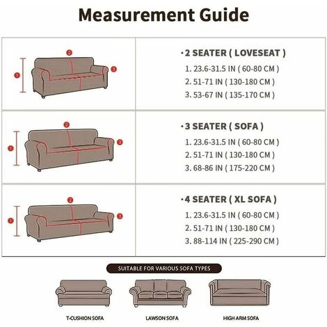 SIZE MEASUREMENT: 2 seater loveseat slipcover fits sofas 135cm-170cm (53-67) in length; 3-seater slipcover fits sofa 175cm-220cm (69-86) long; 4 seater sofa covers fit sofa from 225cm to290cm (88-114). Please measure your sofa before purchasing.