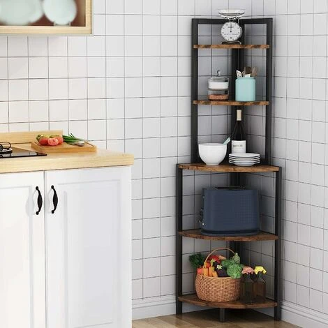 - Corner Shelf Storage Rack with Innovative Design: 5-tier space-saving corner shelf storage rack. A smooth round edge protects you and your family from getting scratched. 90° right angle design in the rear, flush against wall corner perfectly.