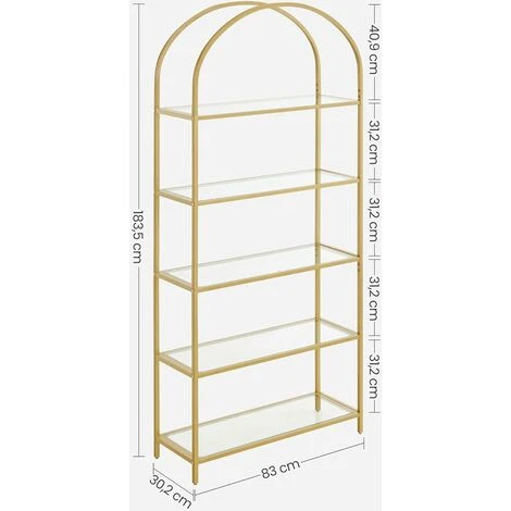 1.A WORTHY STAGE: Your precious collectibles should be displayed on a rack they deserve. Just like this shelf, which has elegant arches and 5 glass shelves surrounded by gold-coloured steel, designed to make your affectionate items stand out