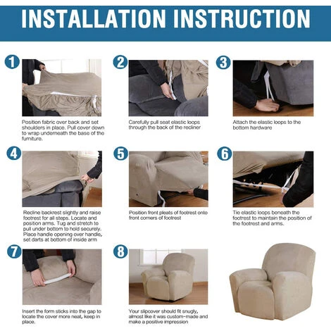 Washing and Care: This recliner cover is easy to care for. Machine washable in cold water, tumble dry low, please do not bleach or iron. Easy to install: check the installation guide carefully, it can be finished in 10 minutes by one person.Â