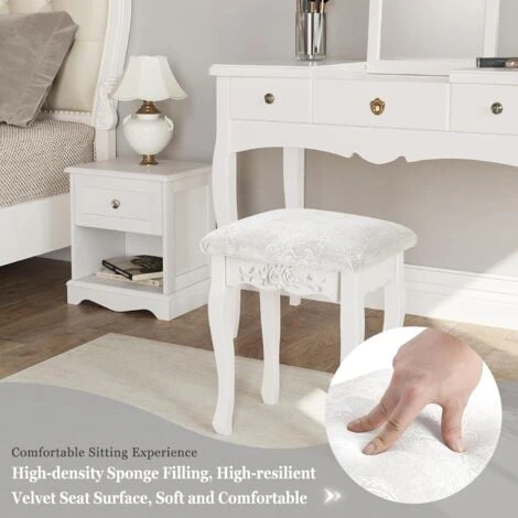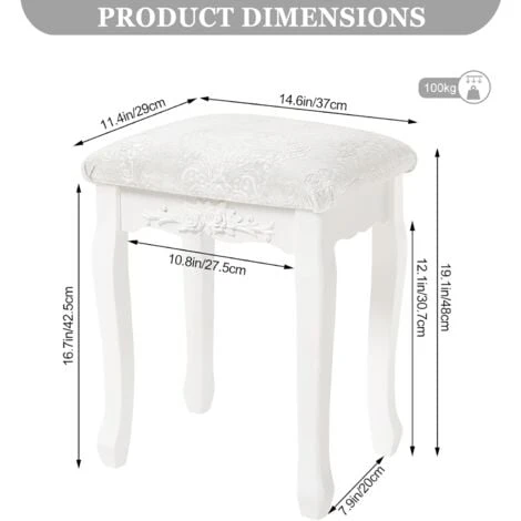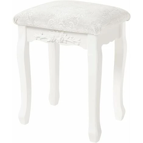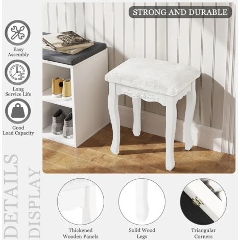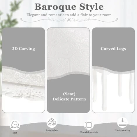 Fine DecorationThe exquisite embossed roses on the side and the delicate floral pattern on the upholstery represent its Baroque style. elegant and romantic. to be an addition to your space. | Padded SeatFilled with soft and comfortable sponge. which is not easy to deform as well. the upholstered seat is a perfect spot for you to sit on when putting on your makeup. | Safety PadsEach foot is equipped with a pad underneath so that those feet won&rsquo.t scratch the floor and make it stable and non-slip. | To be a present!Thanks to its modernity and great design. which can blend into the surroundings easily. this white stool is also an ideal item to be a present for your family and friends during anniversaries and holidays. |