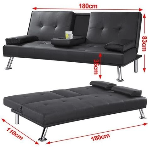 Our foldable sofa bed is made of high-quality faux leather. This multi-functional sofa bed offers great durability as well as looking great. The sofa bed can comfortably sleep one adult. It includes 2 removable pads as shown in picture, arm cushions for extra support and for use as pillows when in bed mode. Also, the cushions can be taken off easily and to be used as pillows. Drop down drinks table makes for easy relaxation in front of the TV! You can enjoy a nice refreshing drink and a few snacks while watching your favourite show.