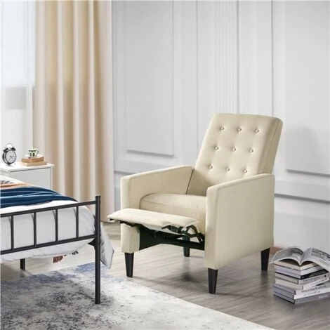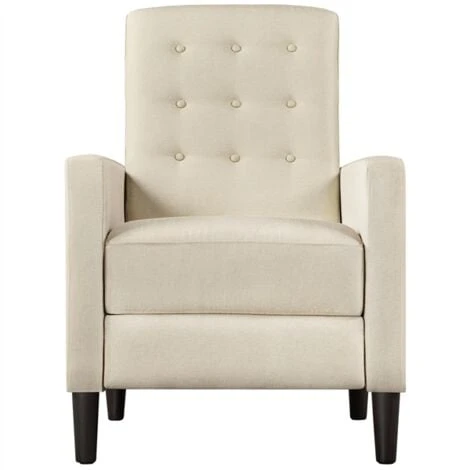 Spruce up your bedroom or living room in streamlined style with mid-century modern fabric recliner. Founded atop four conical legs in black finish, this piece features a manufactured wooden frame, foam fill, and solid-hued 100% upholstery that’s easy to clean and durable to use. The button-tufted details on the back showcase a touch of texture, and its neutral color tone can coordinate with any home decor. Fully reclined back and pop-up footrest let you relax and kick back with a movie after a long day at work.