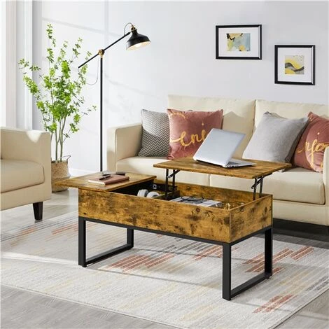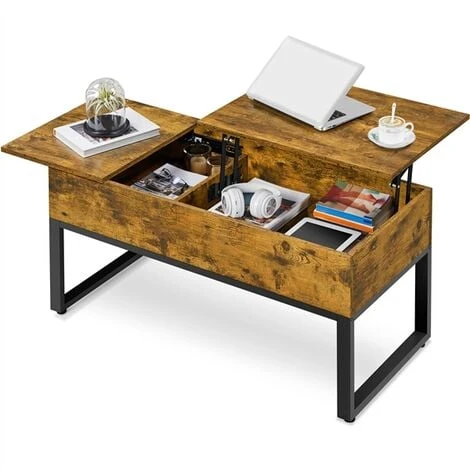 This split lift-top coffee table is crafted of CARB P2 compliant manufactured wood awash in a distressed coloring and powder-coated metal base, this coffee table is the perfect mixture of rural and urban which can seamlessly blend with any lodge or modern farmhouse/industrial aesthetic. The split tabletop features a soft close gas lift top that can be raised to 61cm and a slide-out top. Under the two tops lies two hideaway storage for your daily items. A simple setup is required for this coffee table.